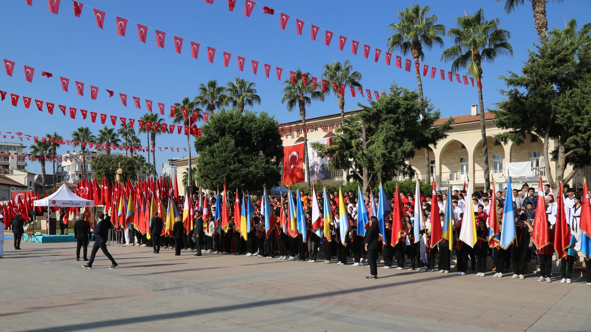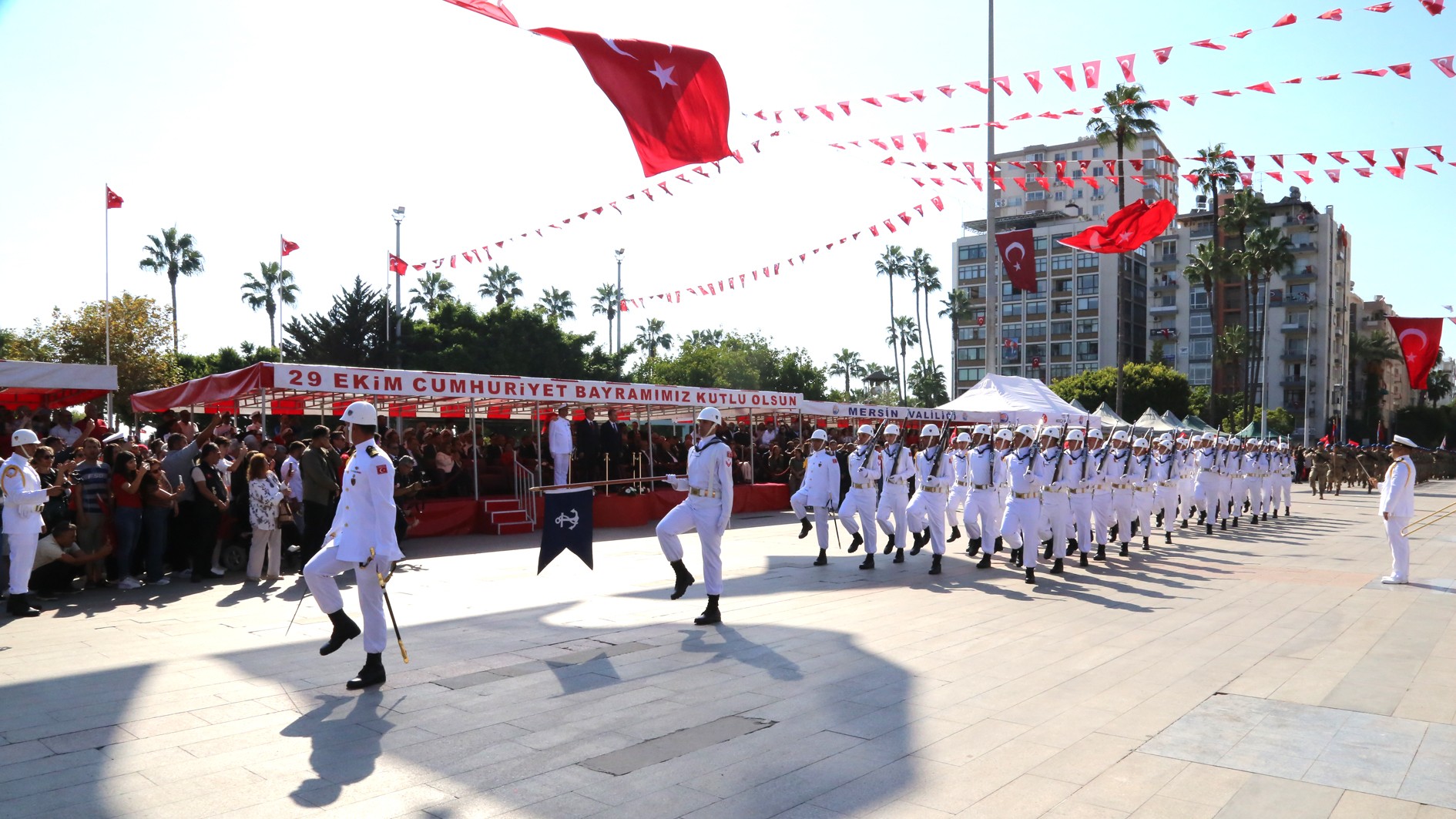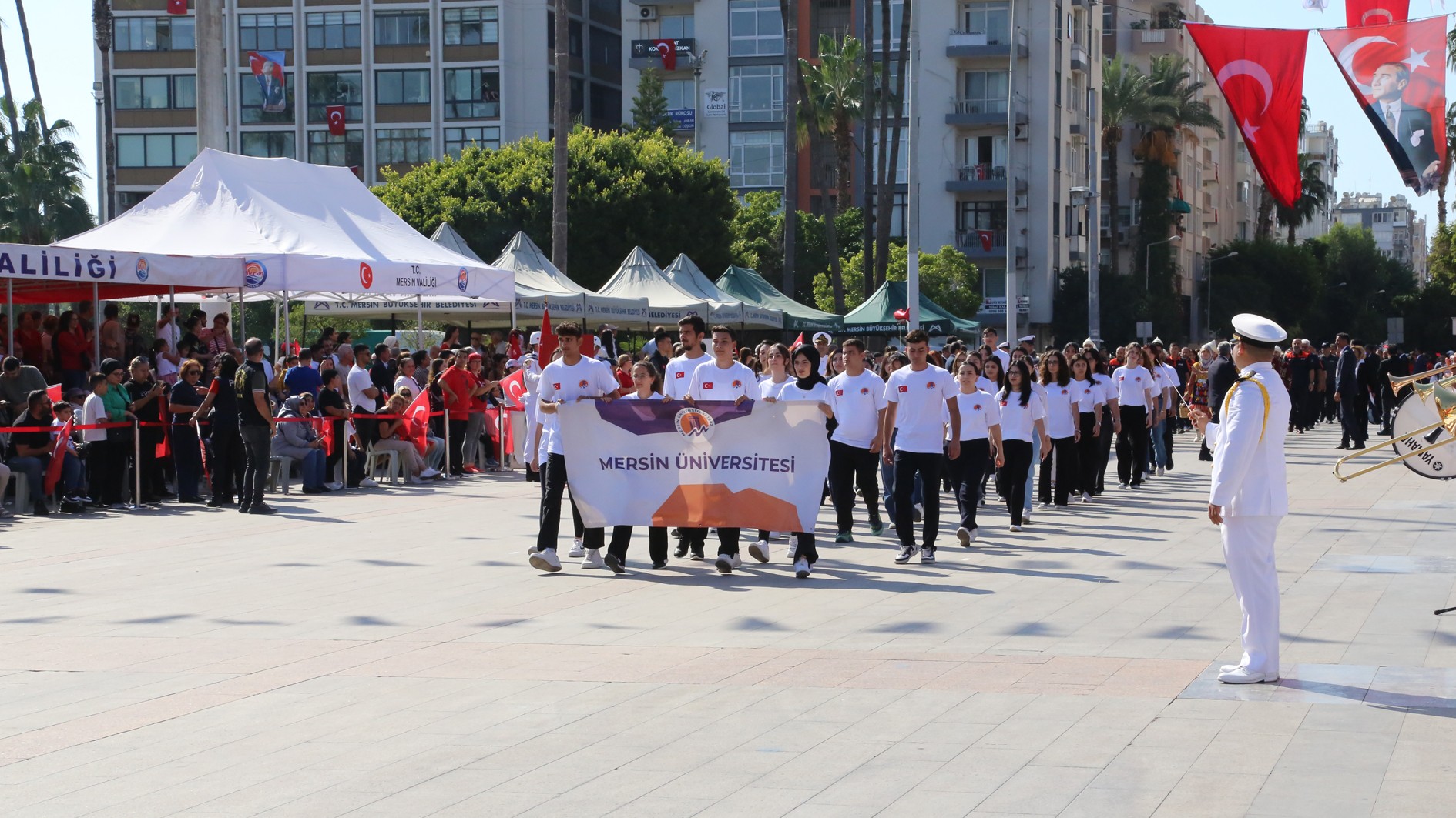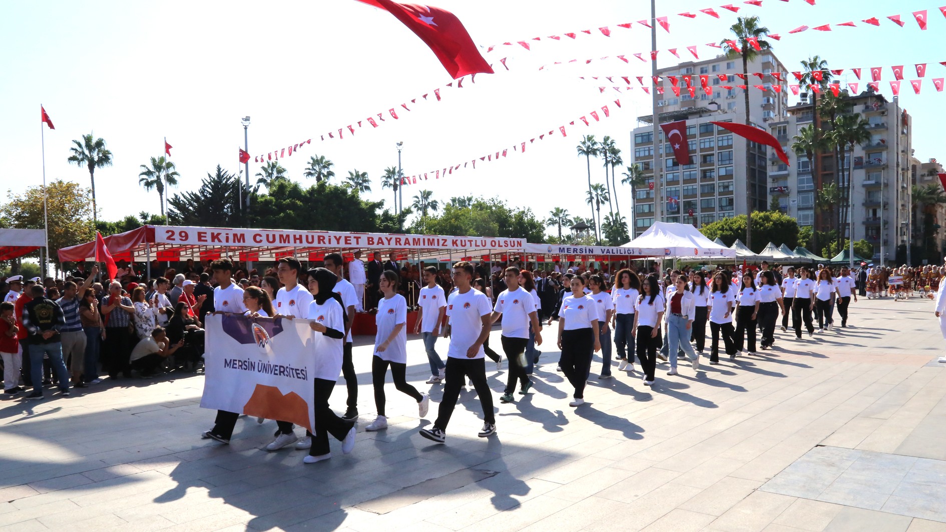 29 Ekim Çarşamba günü Mersin Cumhuriyet Alanı’nda gerçekleştirilen kutlama programına; Mersin Valisi Atilla Toros, Akdeniz Bölge ve Garnizon Komutanı Tuğamiral Soner Kazankaya, Mersin Büyükşehir Belediye Başkanı Vahap Seçer, Mersin Milletvekilleri, il protokolü, Rektörümüz Prof. Dr. Erol Yaşar ve çok sayıda vatandaş katıldı.