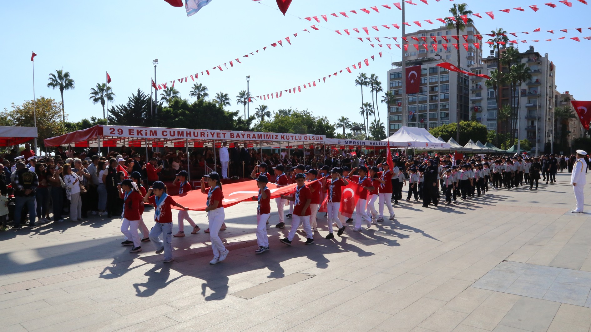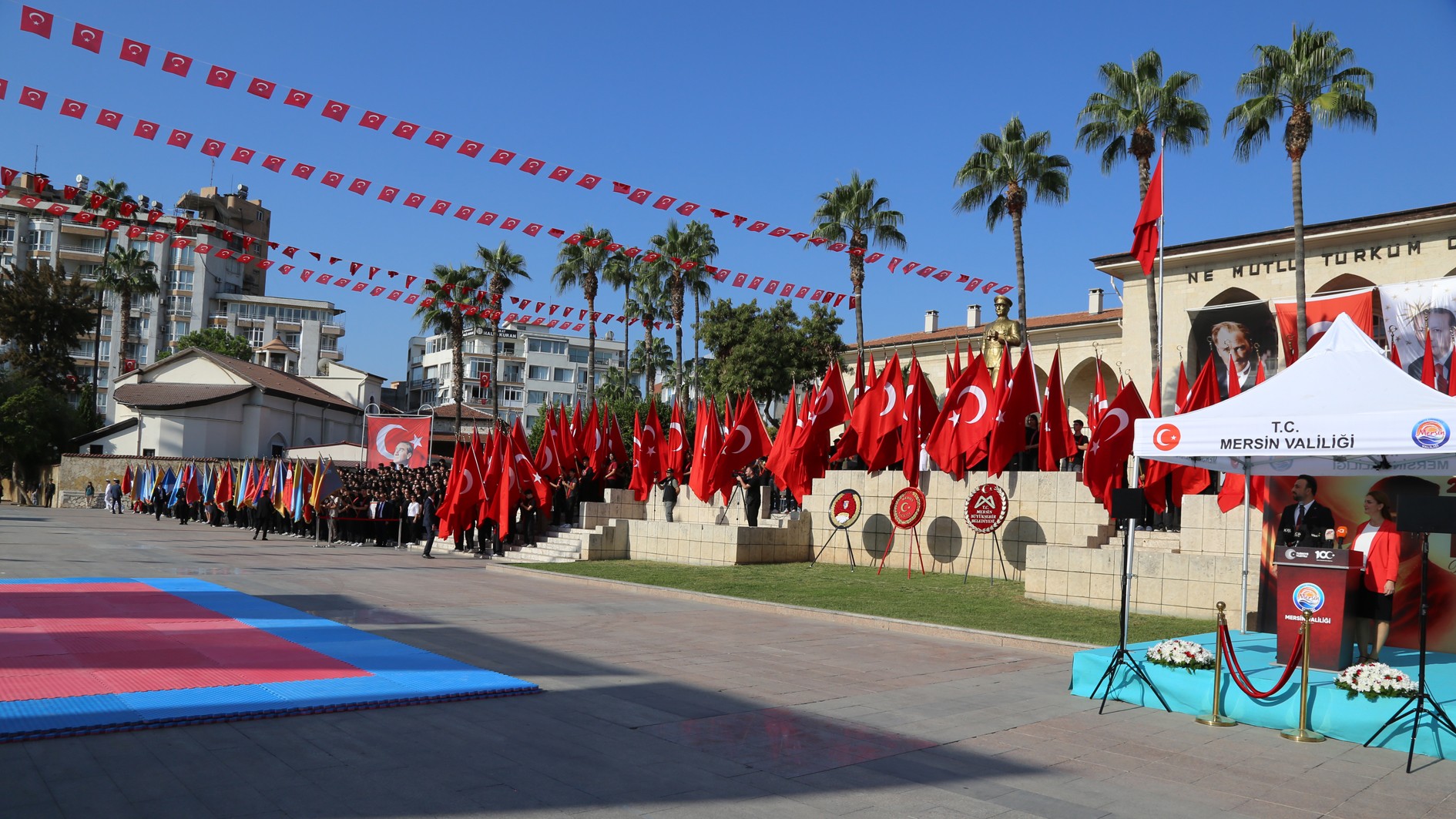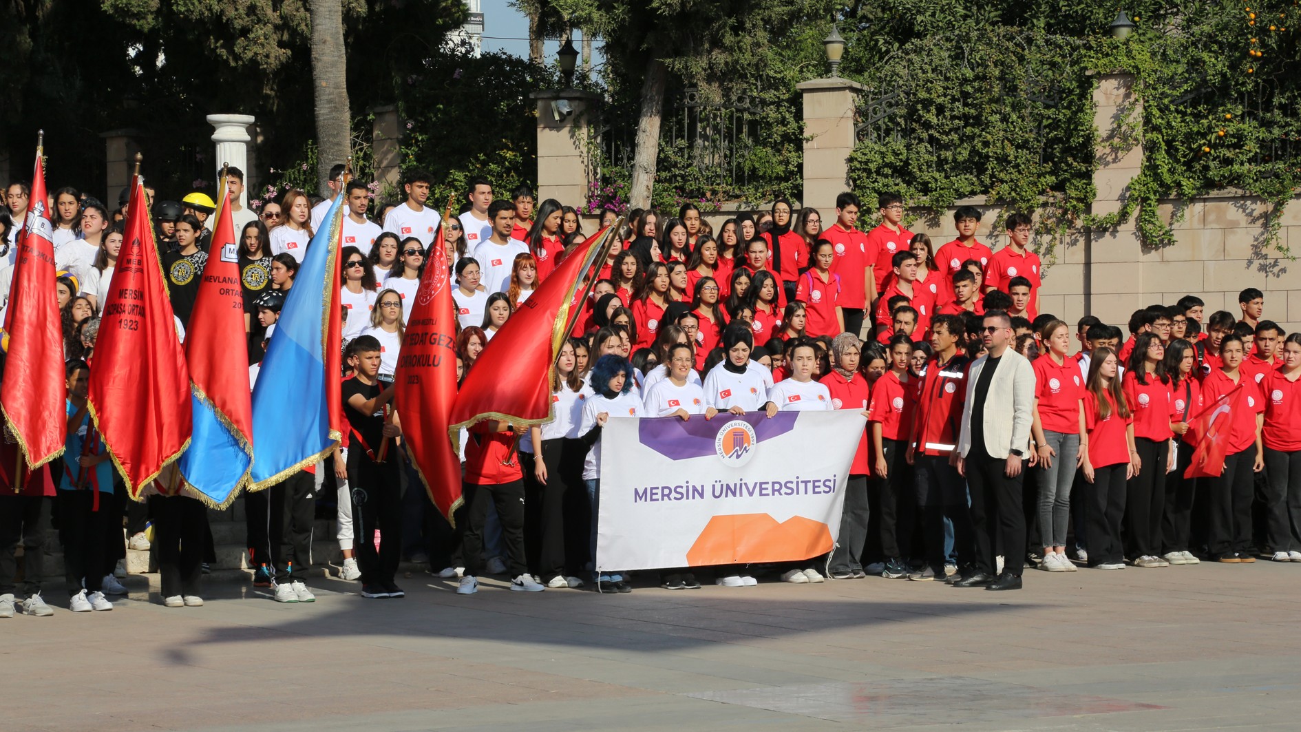 29 Ekim Çarşamba günü Mersin Cumhuriyet Alanı’nda gerçekleştirilen kutlama programına; Mersin Valisi Atilla Toros, Akdeniz Bölge ve Garnizon Komutanı Tuğamiral Soner Kazankaya, Mersin Büyükşehir Belediye Başkanı Vahap Seçer, Mersin Milletvekilleri, il protokolü, Rektörümüz Prof. Dr. Erol Yaşar ve çok sayıda vatandaş katıldı.