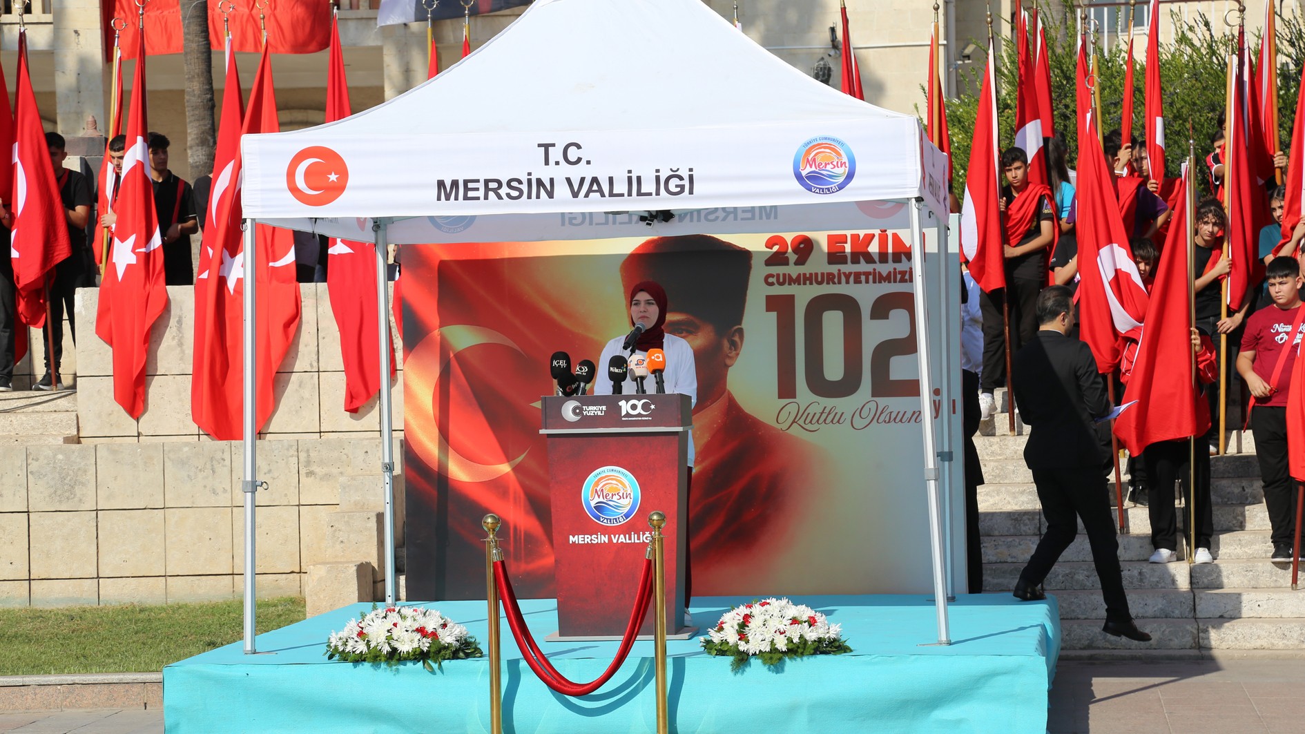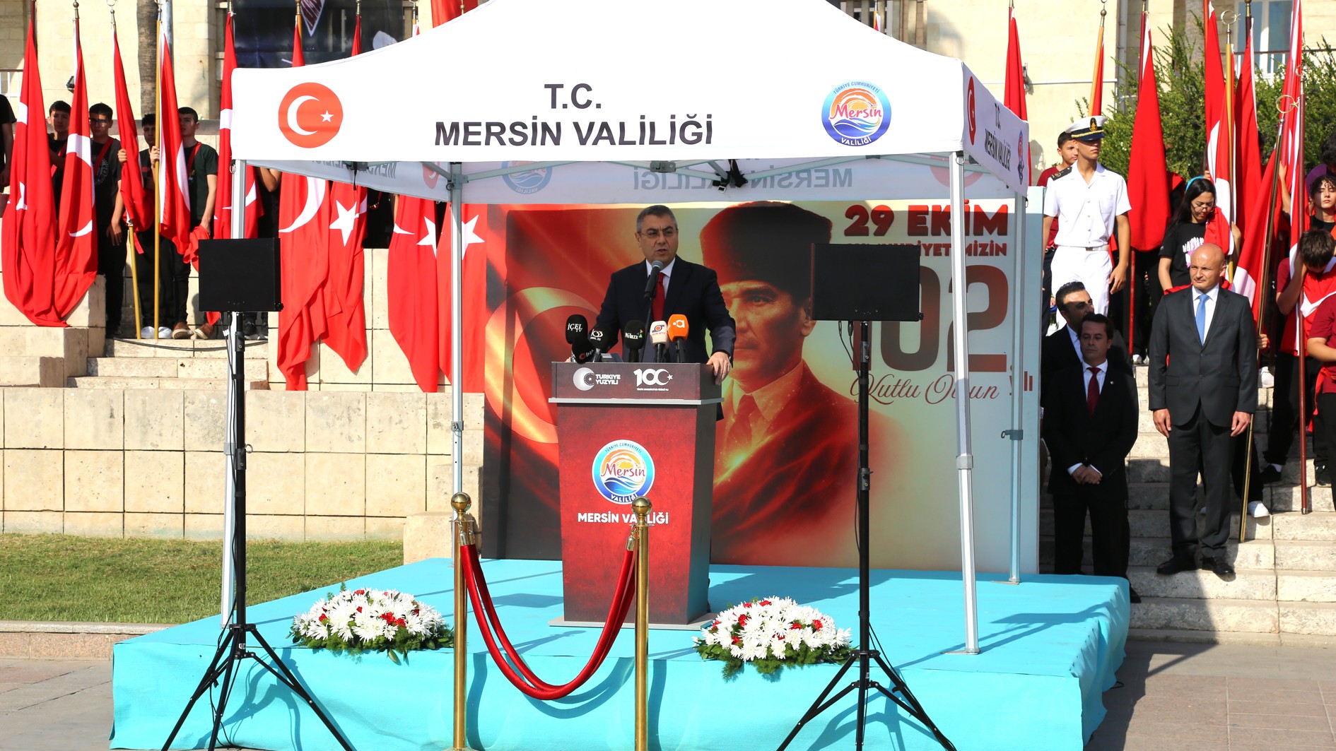 Konuşmasına, yüreklerinde büyük bir gurur ve coşku taşıdıklarını ifade ederek başlayan Mersin Valisi Atilla Toros, “Bugün, Cumhuriyetimizin ilanının 102’nci yıl dönümü. Cumhuriyet, şehitlerimizin ve gazilerimizin emaneti; gençlerimizin ise en kıymetli geleceğidir. Yürekten inanıyorum ki yarının teminatı olan gençlerimiz, Cumhuriyetimizin ikinci yüzyılında bir yıldız gibi parlayacak; ülkemizin adını şanla ve şerefle her alanda yazdırmaya devam edecektir. Bu duygularla başta Cumhuriyetimizin kurucusu Gazi Mustafa Kemal Atatürk olmak üzere kahraman silah arkadaşlarını, bu toprakları canlarıyla, kanlarıyla vatan kılan aziz şehitlerimizi ve kahraman gazilerimizi rahmetle ve şükranla yad ediyorum. Cumhuriyet Bayramımız kutlu olsun.” şeklinde konuştu.